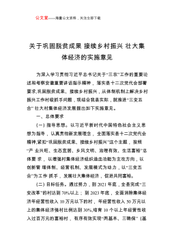 公文堂——海量公文资料,关注立即下载关于巩固脱贫成果接续乡村振兴壮大集体经济的实施意见为深入学习贯彻习近平总书记关于“三农”工作的重要论述和考察安徽重要讲话指示精神,落实县十二次党代会部署要求,巩固脱贫成果、接续乡村振兴,从体制机制上解决乡村振兴工作村级抓手问题,现结合我县实际,就推进“三变五合”壮大村集体经济发展提出如下实施意见。一、总体要求(一)指导思想。以习近平新时代中国特色社会主义思想为指导,认真贯彻新发展理念,全面落实县十二次党代会精神,紧扣“巩固脱贫成果、接续乡村振兴”这个主题,按照“产业兴旺、生态宜居、乡风文明、治理有效、生活富裕”总体要求,以增强村集体经济组织造血功能为主攻方向...