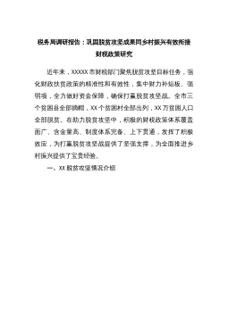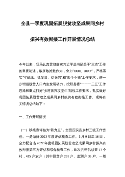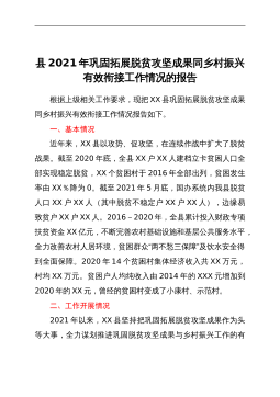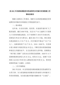 县2021年巩固拓展脱贫攻坚成果同乡村振兴有效衔接工作情况的报告根据上级相关工作要求,现把XX县巩固拓展脱贫攻坚成果同乡村振兴有效衔接工作情况报告如下。一、基本情况近年来,XX县以攻势、促攻坚,在连续作战中扩大了脱贫战果。截至2020年底,全县XX户XX人建档立卡贫困人口全部实现稳定脱贫,XX个贫困村于2016年全部出列,贫困发生率由XX%降为0。截至2021年5月底,国办系统内我县脱贫人口XX户XX人(其中脱贫不稳定户XX户XX人),边缘易致贫户XX户XX人。2016-2020年,全县累计投入财政专项扶贫资金XX亿元,不断完善农村基础设施和基层公共服务水平,全力改善农村人居环境,贫困群众“两...