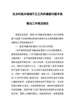 X乡“清廉X”建设十大行动和构建“大监督”工作格局暨乡村振兴领域不正之风和腐败问题专项整治工作情况报告根据会议安排,现将X乡“清廉X”建设十大行动和构建“大监督”工作格局暨乡村振兴领域不正之风和腐败问题专项整治工作情况报告如下:一、推进“清廉X”建设十大行动工作情况X乡严格按照县委“清廉X”建设十大行动部署要求,根据实际及时制定《X乡“清廉X”建设十大行动工作任务分解清单》,并严格按照要求抓好工作落实。一是扎实开展政治监督“护航行动”。2023年以来,全乡共召开党委会议4次,理论中心组学习2次。二是认真开展“一把手”和领导班子监督“引领行动”。与10位班子成员开展谈心谈话20余次,开展“一把手...