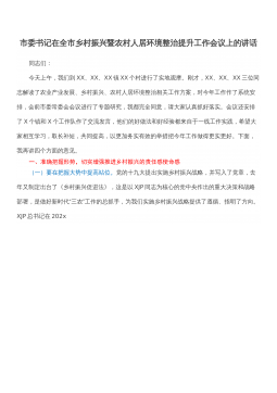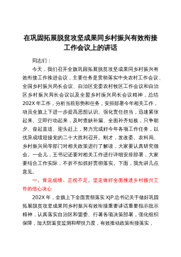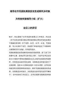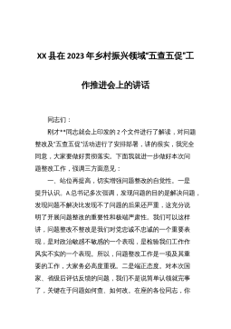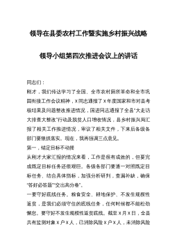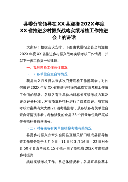 县委分管领导在XX县迎接202X年度XX省推进乡村振兴战略实绩考核工作推进会上的讲话大家好!根据会议安排,下面由我通报全县当前迎接202X年度XX省推进乡村振兴战略实绩考核工作情况,并就下一步工作提一些建议。一、我县迎检工作总体情况(一)各单位自查自评情况我县自2月9日以来多次召开迎检工作部署会,对如何做好202X年度XX省推进乡村振兴战略实绩考核工作做了全面的部署。各镇各有关单位均对标省实绩考核方案及评议评分标准,对各项业务指标进行了自查自评。省实绩考核方案共有六大类21项考核指标,从各镇各有关单位自查自评情况来看,考核涉及的全县33个行业单位均已完成任务指标并自评满分。(二)对各镇各有关单...