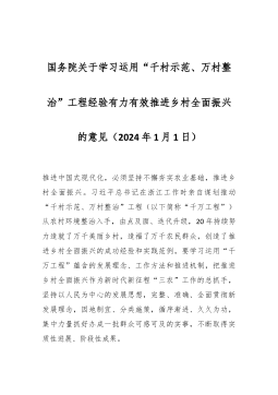 国务院关于学习运用“千村示范、万村整治”工程经验有力有效推进乡村全面振兴的意见(2024年1月1日)推进中国式现代化,必须坚持不懈夯实农业基础,推进乡村全面振兴。习近平总书记在浙江工作时亲自谋划推动“千村示范、万村整治”工程(以下简称“千万工程”)从农村环境整治入手,由点及面、迭代升级,20年持续努力造就了万千美丽乡村,造福了万千农民群众,创造了推进乡村全面振兴的成功经验和实践范例。要学习运用“千万工程”蕴含的发展理念、工作方法和推进机制,把推进乡村全面振兴作为新时代新征程“三农”工作的总抓手,坚持以人民为中心的发展思想,完整、准确、全面贯彻新发展理念,因地制宜、分类施策,循序渐进、久久为功,...