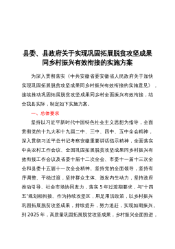 县委、县政府关于实现巩固拓展脱贫攻坚成果同乡村振兴有效衔接的实施方案为深入贯彻落实《中共安徽省委安徽省人民政府关于加快实现巩固拓展脱贫攻坚成果同乡村振兴有效衔接的实施意见》,接续推动巩固拓展脱贫攻坚成果同乡村全面振兴有效衔接,结合我县实际,制定如下实施方案。一、总体要求坚持以习近平新时代中国特色社会主义思想为指导,全面贯彻党的十九大和十九届二中、三中、四中、五中全会精神,深入贯彻习近平总书记考察安徽重要讲话指示精神,全面落实中央农村工作会议、全国巩固拓展脱贫攻坚成果同乡村振兴有效衔接工作会议及省委十届十二次全会、市委十一届十三次全会和县委十五届十一次全会精神。坚持党的全面领导,坚持有序调整、平...