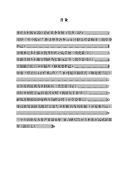 目录推进乡村振兴需注意的几个问题(党委书记)...........................2围绕“五个振兴”推进脱贫攻坚与乡村振兴有效衔接(镇党委书记)...............................................................................................3全面推进乡村振兴提升组织力是关键(镇党委书记)...............5党建引领乡村振兴战略的实践与思考(镇党委书记)...............6文旅融合助力乡村振兴(镇党委书记)................................