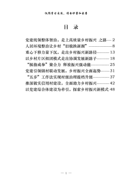 仅限学习交流,请勿抄袭和出售—1—目录党建统领整体智治,走上高质量乡村振兴之路.....2人居环境整治让乡村“旧貌换新颜”........................8重心下移力量下沉,走出乡村振兴新路径.............13以乡村片区组团模式走出协调发展新路子.............18“握指成拳”聚合力释放振兴强动能...................25党建引领镇村联动发展,乡村振兴全面起势.........31“五步”工作法实现村级治理提档升级.................37推深做实信用村建设,全面助力乡村振兴.............42以党建综合体建设为牵引,...