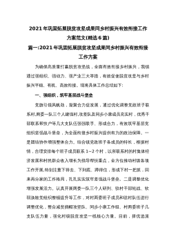 2021年巩固拓展脱贫攻坚成果同乡村振兴有效衔接工作方案范文(精选6篇)篇一:2021年巩固拓展脱贫攻坚成果同乡村振兴有效衔接工作方案为确保高质量打赢脱贫攻坚战,全面有效衔接乡村振兴,我镇通过强组织、强动力、强产业三大举措,有效促使脱贫攻坚与乡村振兴平稳、有机、高效衔接。现将具体工作总结如下:一、强组织,筑牢基层战斗堡垒党旗引领风帆劲,凝聚合力促发展,通过优化调整党政班子联系村,两委一队三个人建强村,攻坚队及同步小康成员充实村,优秀干部联系帮扶户等几大支队伍强强联手、形成合力,有效筑牢基层党组织坚强战斗堡垒,为全面衔接乡村振兴提供有力的政治保障。一是团结协作增强整体合力。结合镇党政班子各成员的...