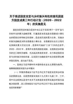 中共XX市委XX市人民政府关于推进脱贫攻坚与乡村振兴有机衔接巩固提升脱贫成果三年行动计划脱贫攻坚和乡村振兴是党中央立足于实现“两个一百年”奋斗目标作出的重大战略部署。打赢脱贫攻坚战是全面建成小康社会的底线任务和标志性指标,是必须完成的重大任务。实施乡村振兴战略是决胜全面建成小康社会、全面建设社会主义现代化国家的重大历史任务,是新时代做好“三农"工作的总抓手。2020-2022年,是我市全面巩固脱贫成效、全面推进乡村振兴的交汇期和关键期。为决战决胜脱贫攻坚,全力推进脱贫攻坚与乡村振兴有机衔接,以实际行动确保党中央决策部署在XX落实落地,提出如下意见。一、坚持以习近平新时代中国特色社会主义思想为指...