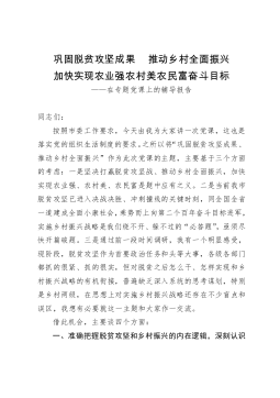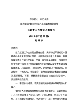 不忘初心牢记使命奋力绘就淮阴乡村振兴高质量发展新画卷同志们:这次区委工作会议的主要任务是,高举习近平新时代中国特色社会主义思想伟大旗帜,全面贯彻党的十九大精神,认真落实省委十三届六次全会、市委七届九次全会精神,围绕中央和省市关于实施乡村振兴战略的决策部署以及省委专项巡视反馈意见,总结成绩,对标找差,动员全区上下提高站位、抬高标杆,不忘初心、牢记使命,奋力绘就淮阴乡村振兴高质量发展新画卷。下面,根据区委常委会(扩大)会议讨论精神,我主要讲四点意见。一、客观总结成绩,切实增强实施乡村振兴战略的信心和决心党的十九大对实施乡村振兴战略作出部署后,区委在去年7月召开的区委工作会议上进行了深入贯彻,提出了...
