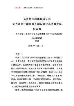 公文堂——海量公文资料,关注立即下载奋进新征程勇作排头兵全力谱写住房和城乡建设事业高质量发展新篇章——在传达学习县乡村干部会议精神暨2021年工作动员大会上的讲话刘勇(2021年3月5日)同志们:今天,我们召开2020年总结表彰暨2021年工作动员大会,主要任务是:深入学习贯彻习近平总书记关于住房和城乡建设工作、在湖南考察时重要指示批示精神,全面贯彻党的十九届五中全会、全国及省市住建工作会议精神,认真落实县委农村工作暨乡村负责干部会议精神,总结2020年和“十三五”住房和城乡建设工作,表彰先进,明确2021年重点任务。动员和鼓励全局上下以更加坚定的信心、更加昂扬的斗志,主动作为、真抓实干,努力...