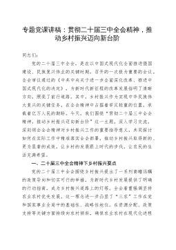 专题党课讲稿:贯彻二十届三中全会精神,推动乡村振兴迈向新台阶同志们:党的二十届三中全会,是在以中国式现代化全面推进强国建设、民族复兴伟业的关键时期,召开的一次极为重要的会议。全会审议通过的《中共中央关于进一步全面深化改革、推进中国式现代化的决定》,为新时代新征程的改革发展指明了清晰方向,照亮了前行道路。其中,乡村振兴作为实现中华民族伟大复兴的关键任务,在全会精神中占据着举足轻重的位置,承载着亿万人民的期盼。今天,我们围绕“贯彻二十届三中全会精神,推动乡村振兴迈向新台阶”这一主题,深入学习交流,深刻领会全会精神对乡村振兴工作的重要指导意义,共同探讨如何在实际工作中精准落实全会部署,推动乡村振兴取...