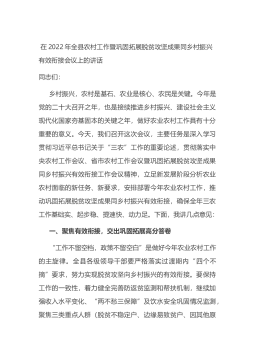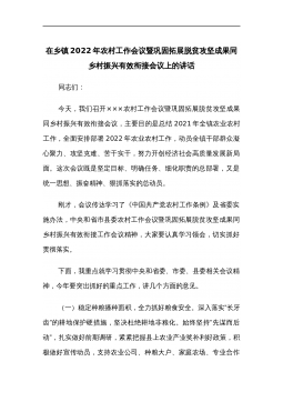 在乡镇2022年农村工作会议暨巩固拓展脱贫攻坚成果同乡村振兴有效衔接会议上的讲话同志们:今天,我们召开×××农村工作会议暨巩固拓展脱贫攻坚成果同乡村振兴有效衔接会议,主要目的是总结2021年全镇农业农村工作,全面安排部署2022年农业农村工作,动员全镇干部群众凝心聚力、攻坚克难、苦干实干,努力开创经济社会高质量发展新局面。这次会议既是坚定目标、明确任务、细化职责的总部署,又是统一思想、振奋精神、狠抓落实的总动员。刚才,会议传达学习了《中国共产党农村工作条例》及省委实施办法,中央和省市县委农村工作会议暨巩固拓展脱贫攻坚成果同乡村振兴有效衔接工作会议精神,大家要认真学习领会,切实抓好贯彻落实。下面...