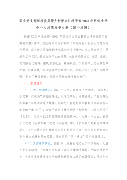 国企党支部纪检委员暨乡村振兴驻村干部2021年组织生活会个人对照检查材料(四个对照)根据XX公司党支部《2021年度组织生活会暨民主评议党员工作实施方案》要求,我坚持以习近平新时代中国特色社会主义思想为指导思想,深入学习贯彻党的十九届六中全会精神,本人结合学习、思想和工作实际,查找自身存在的问题,力求把问题找实、找深、找透。现对照会议精神:围绕思想政治、精神状态、工作作风、纪检廉政等方面,认真查找了自身存在的问题和不足,深刻分析了问题产生的原因,制定了整改措施。现将对照检查情况报告如下:一、落实情况(一)学习贯彻情况。2021年以来,我按照“学党史、悟思想、办实事、开新局”的整体要求,以学习研...