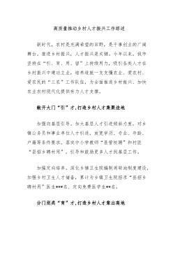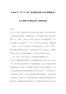 在2024年“百千万工程”高质量发展能力培训班暨推进乡村全面振兴专题培训班上的辅导报告同志们:“百千万工程”是我省为深入贯彻乡村振兴战略,推动农村经济社会全面发展而实施的一项重要举措。它旨在通过培育百名乡村振兴领军人才、扶持千个特色产业项目、带动万户农民增收致富,为乡村全面振兴注入强劲动力。今天,我们举办这次培训班,就是要进一步提升广大乡村干部和骨干人才的能力素质,为“百千万工程”的高质量发展提供坚实的人才保障和智力支持。借此机会,很荣幸由我为大家作一堂专题辅导报告,与同志们共同探讨交流。一、统一思想,充分认清乡村产业高质量发展的重大意义乡村产业高质量发展的进程,代表着国家科技在乡村产业中的应...