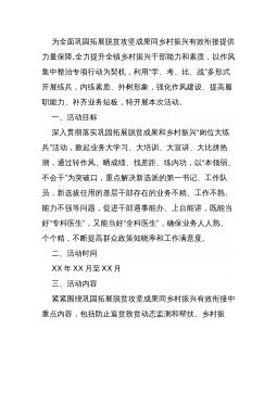 为全面巩固拓展脱贫攻坚成果同乡村振兴有效衔接提供力量保障,全力提升全镇乡村振兴干部能力和素质,以作风集中整治专项行动为契机,利用“学、考、比、战”多形式开展练兵,内练素质、外树形象,强化作风建设、提高履职能力、补齐业务短板,特开展本次活动。一、活动目标深入贯彻落实巩固拓展脱贫成果和乡村振兴“岗位大练兵”活动,掀起业务大学习、大培训、大宣讲、大比拼热潮,通过转作风、晒成绩、找差距、练内功,以“本领弱、不会干”为突破口,重点解决新选派的第一书记、工作队员,新选拔任用的基层干部存在的业务不精、工作不熟、能力不强等问题,促进干部遇事能办、上台能讲,既能当好“专科医生”,又能当好“全科医生”,确保业务人...