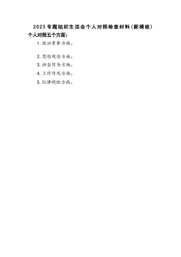 2023专题组织生活会个人对照检查材料(新模板)个人对照五个方面:1.政治素养方面。2.思想观念方面。3.担当作为方面。4.工作作风方面。5.纪律规矩方面。正文内容:根据这次专题生活会的要求,我围绕“以学铸魂、以学增智、以学正风、以学促干"等方面进行了一次深刻的思想淬炼和灵魂洗礼。紧扣会议主题,结合个人思想、学习和工作实际,查摆出自身存在的主要问题,现对照检查如下:一、存在的问题1.政治素养方面。能够牢固树立“四个意识",坚定“四个自信",做到“四个服从",但有时候认为理论功底、理论素养是对高级领导干部的要求,工作人员主要是抓落实、具体干,对政治理论学习的重要性迫切性认识不足,尽管每次集中学习...