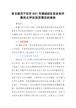 党支部关于召开2021年度组织生活会和开展民主评议党员情况的报告镇党委:根据《关于召开2021年度基层党组织组织生活会和开展民主评议党员的通知》(X党发〔2022〕X号)文件要求,XX镇机关第一党支部于2022年1月X日晚上召开了2021年度组织生活会和开展了民主评议党员。现将情况报告如下:一、会前准备XX镇机关第一党支部紧密结合党支部和党员思想学习工作实际,严格落实组织生活会和民主评议党员相关制度规定和任务要求,重点做好了以下5个方面的准备工作。(一)完成各项学习任务2022年1月X日晚上支委会集中组织支部党员进行专题学习研讨,深入学习习近平总书记"七一"重要讲话精神,学习党的十九届六中全会...