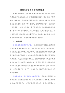 组织生活会支部书记述职报告按照区委组织部《关于召开2018年度基层党组织组织生活会和开展民主评议党员的通知》(忻府组通[2019]4号)要求,紧扣“改革创新、奋发有为”这一主题,围绕深入学习贯彻习近平新时代中国特色社会主义思想。树牢“四个意识”,坚定“四个自信”,坚决做到“两个维护”,改进工作作风,勇于担当作为,坚决贯彻党的决策部署。在深入学习研讨基础上,广泛征求意见,认真开展谈心谈话,深入查摆问题,深刻剖析存在问题的原因,认真制定整改措施,形成了班子对照检查材料。现将对照检查情况汇报如下:一、存在问题(一)发挥政治引领作用方面。一是组织力提升有差距,抓具体工作落实多,抓支部建设力度不足,在及...