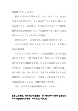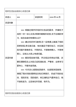 组织生活会会前谈心谈话记录谈话人xxx谈话时间xxxx年xx月谈话对象谈话内容xxx:根据近期开好组织生活会的要求,开展班子成员一对一谈心交流,希望你能畅所欲言,关于近期的学习,结合自身你有哪些认识?xxx:通过党史学习教育,在一定程度上提高了党的思想觉悟,责任意识差,有时满足于管好自己,对见到的问题不愿意多说,不想多说,不愿意得罪人,不想得罪人,没有从大局上考虑问题。xxx:能发现自身问题,并正视这些突出问题,还要在理想信念上对自己设有高标准、严要求,业务学习要专心,不能半途而废。xxx:今天谈心使我收获颇丰,也使我深受教育,增强了我对党的理想信念和纪律意识,忠诚于党的信仰、党的宗旨、党的组...