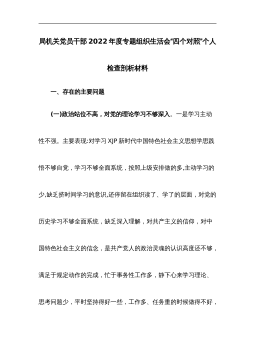 局机关党员干部2022年度专题组织生活会“四个对照”个人检查剖析材料一、存在的主要问题(一)政治站位不高,对党的理论学习不够深入。一是学习主动性不强。主要表现:对学习XJP新时代中国特色社会主义思想学思践悟不够自觉,学习不够全面系统,按照上级安排做的多,主动学习的少,缺乏挤时间学习的意识,还停留在组织读了、学了的层面,对党的历史学习不够全面系统,缺乏深入理解,对共产主义的信仰,对中国特色社会主义的信念,是共产党人的政治灵魂的认识高度还不够,满足于规定动作的完成,忙于事务性工作多,静下心来学习理论、思考问题少,平时坚持得好一些,工作多、任务重的时候做得不好,学习也不够系统,理论学习与实际工作有时...