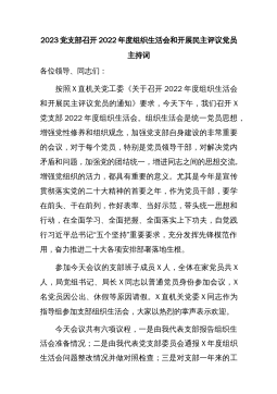 2023党支部召开2022年度组织生活会和开展民主评议党员主持词.
