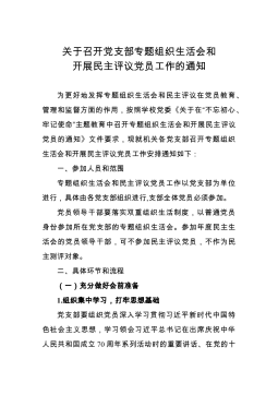 关于召开党支部专题组织生活会和开展民主评议党员工作的通知为更好地发挥专题组织生活会和民主评议在党员教育、管理和监督方面的作用,按照学校党委《关于在“不忘初心、牢记使命”主题教育中召开专题组织生活会和开展民主评议党员的通知》文件要求,现就机关各党支部召开专题组织生活会和开展民主评议党员工作安排通知如下:一、参加人员和范围专题组织生活会和民主评议党员工作以党支部为单位进行,具体由各党支部组织进行,支部全体党员必须参加。党员领导干部要落实双重组织生活制度,以普通党员身份参加所在党支部的专题组织生活会。参加年度民主生活会的党员领导干部,可不参加民主评议党员,不作为民主测评对象。二、具体环节和流程(一)...