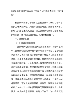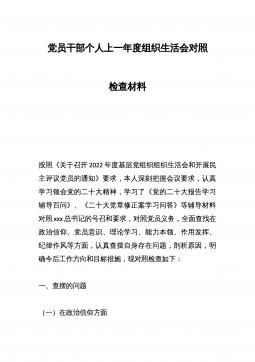 Xx市农业农村局普通党员2023年度组织生活会个人发言提纲根据市委组织部《关于召开2022年度基层党组织组织生活会和开展民主评议党员的通知》要求,我原原本本、逐字逐句的学习了XXX报告和党章,学习了习近平总书记在XXX上的重要讲话精神,学习了《XXX报告学习辅导百问》《XXX党章修正案学习问答》等辅导材料。紧紧围绕“全面贯彻习近平新时代中国特色社会主义思想,深入学习贯彻XXX精神,深刻领悟‘两个确立’的决定性意义,增强‘四个意识’、坚定‘四个自信’、做到‘两个维护’,弘扬建党精神,坚持自我革命,增强党组织政治功能和组织功能”这个主题,深入查找了深刻领悟“两个确立”的决定性意义、坚决做到“两个维...
