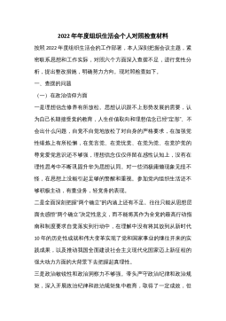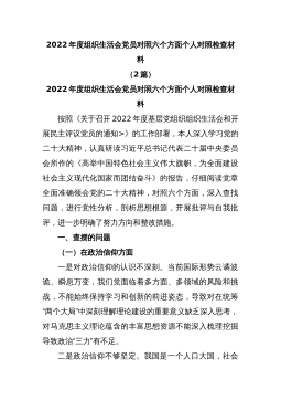 2022年民主组织生活会个人对照检查材料(对照六个方面)按照*党委关于召开2022年民主组织生活会相关要求,我系统学习了党的二十大精神、《习近平谈治国理政》第四卷等内容,为开好这次专题民主生活会打牢了思想基础同时,我紧密联系思想工作实际,深入开展谈心谈话、交流思想、交换意见,对照6个方面,深入查找了自身存在的不足,剖析了问题根源,明确了下步努力方向。现对照检查如下。一、查摆的问题(一)在带头深刻领悟“两个确立”的决定性意义,增强“四个意识”、坚定“四个自信”、做到“两个维护”方面一是关于做到“两个维护”,存在“做”的非常坚决,但“到”的质量、效果有时不特别理想的问题。比如,在落实习近平总书记一...