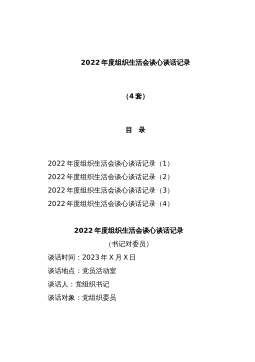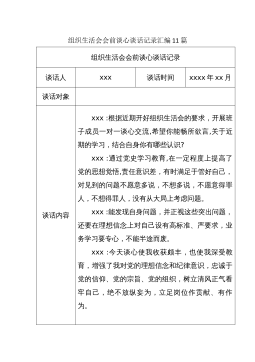 组织生活会会前谈心谈话记录汇编11篇组织生活会会前谈心谈话记录谈话人xxx谈话时间xxxx年xx月谈话对象谈话内容xxx:根据近期开好组织生活会的要求,开展班子成员一对一谈心交流,希望你能畅所欲言,关于近期的学习,结合自身你有哪些认识?xxx:通过党史学习教育,在一定程度上提高了党的思想觉悟,责任意识差,有时满足于管好自己,对见到的问题不愿意多说,不想多说,不愿意得罪人,不想得罪人,没有从大局上考虑问题。xxx:能发现自身问题,并正视这些突出问题,还要在理想信念上对自己设有高标准、严要求,业务学习要专心,不能半途而废。xxx:今天谈心使我收获颇丰,也使我深受教育,增强了我对党的理想信念和纪律意...