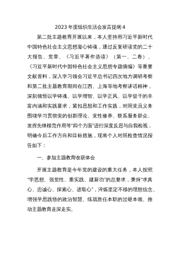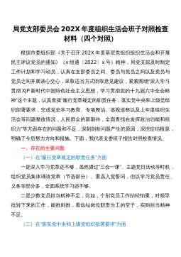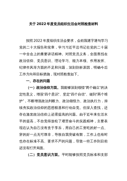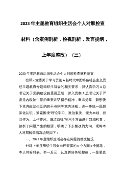 2023年主题教育组织生活会个人对照检查材料(含案例剖析,检视剖析,发言提纲,上年度整改)(三)2023年主题教育组织生活会个人对照检查材料范文 按照x党委关于学习贯彻A新时代中国特色社会主义思想主题教育专题组织生活会的相关要求,我认真学习A总书记关于党的建设的重要思想,深入贯彻A总书记关于严肃党内政治生活的重要讲话指示精神,重温党章、新形势下党内政治生活的若干准则等党内法规,进一步统一思想深化认识,紧紧围绕“理论学习、政治素质、能力本领、担当作为、工作作风、廉洁自律”等六个方面进行对照检查,剖析了问题产生的根源,明确了下步整改的方向。现将本人对照检查情况说明如下: 一、2022年度组织生...