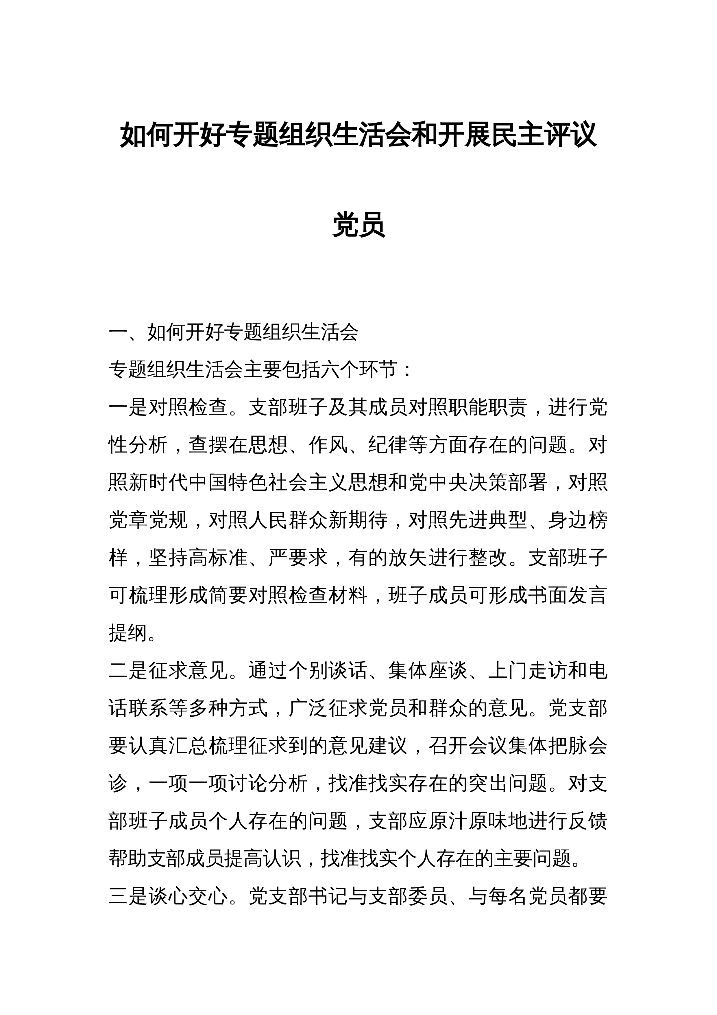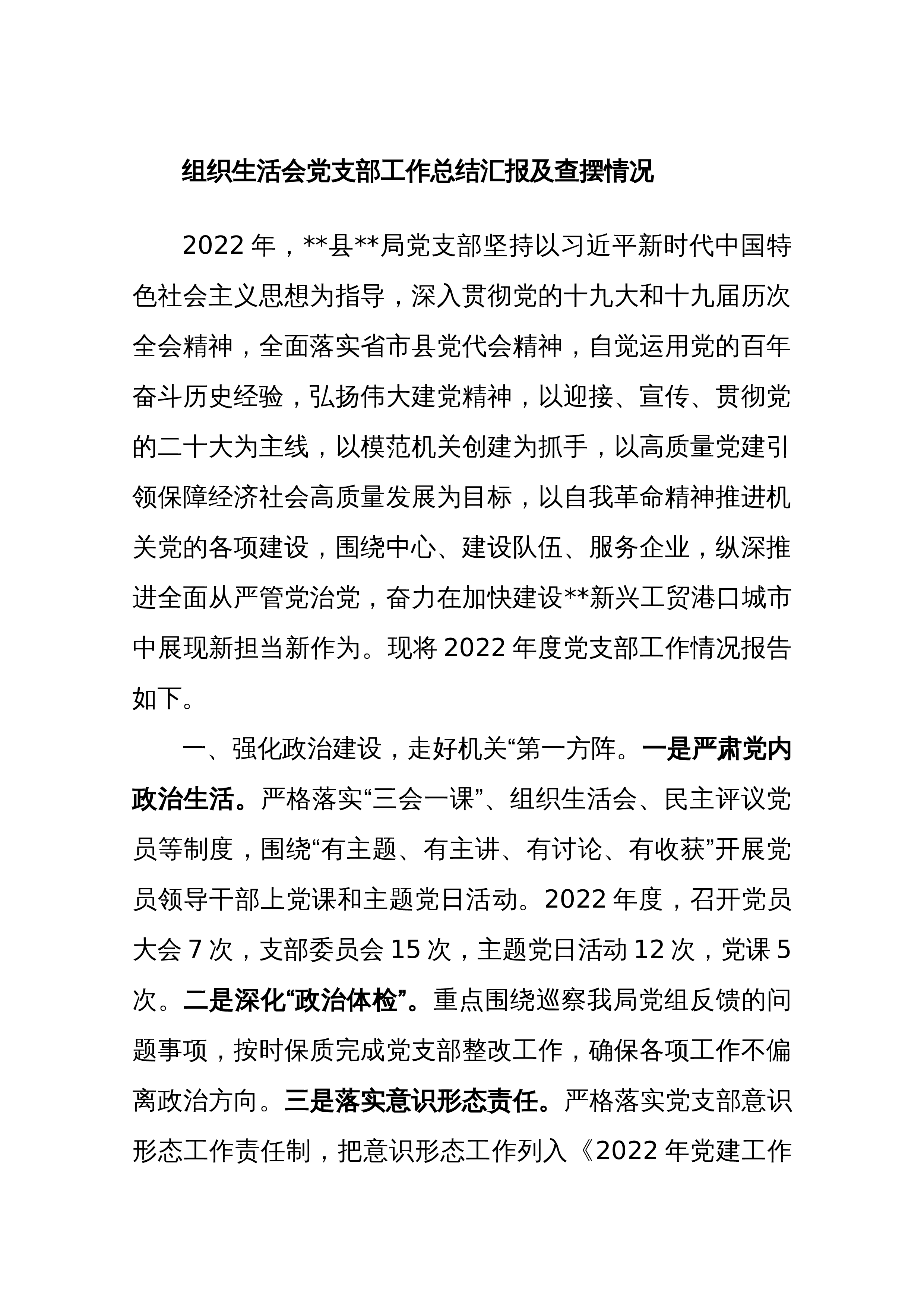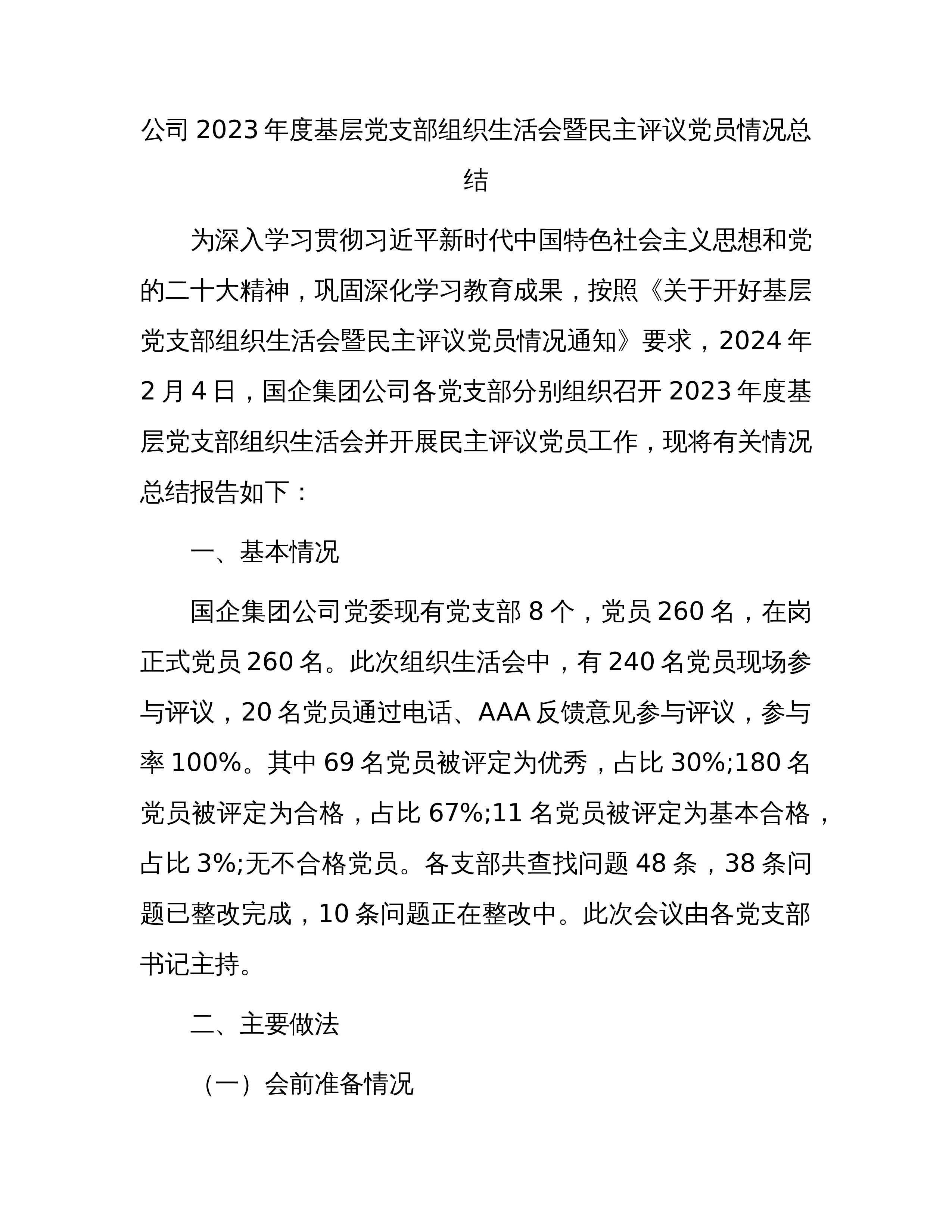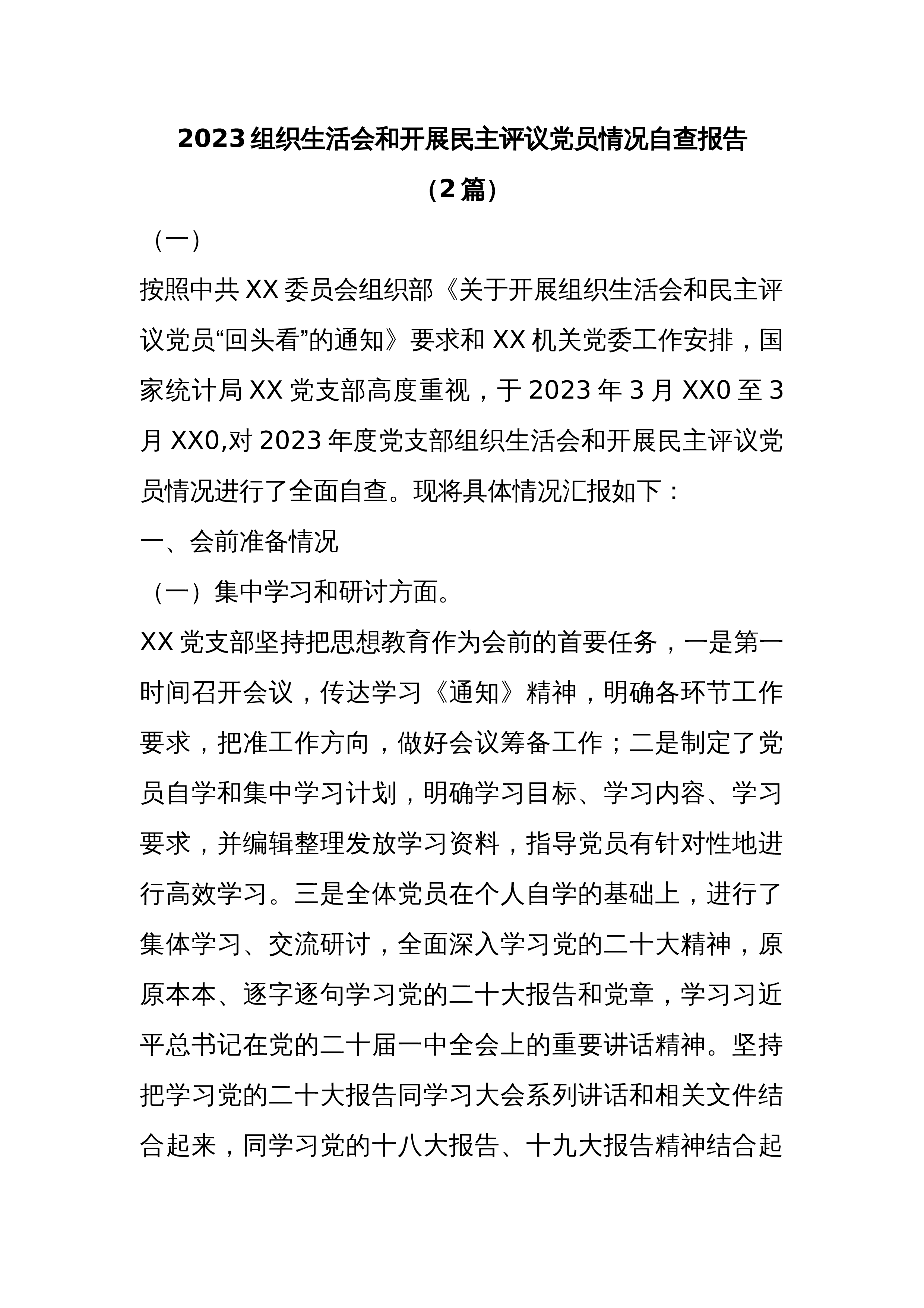 2023组织生活会和开展民主评议党员情况自查报告(2篇)(一)按照中共XX委员会组织部《关于开展组织生活会和民主评议党员“回头看”的通知》要求和XX机关党委工作安排,国家统计局XX党支部高度重视,于2023年3月XX0至3月XX0,对2023年度党支部组织生活会和开展民主评议党员情况进行了全面自查。现将具体情况汇报如下:一、会前准备情况(一)集中学习和研讨方面。XX党支部坚持把思想教育作为会前的首要任务,一是第一时间召开会议,传达学习《通知》精神,明确各环节工作要求,把准工作方向,做好会议筹备工作;二是制定了党员自学和集中学习计划,明确学习目标、学习内容、学习要求,并编辑整理发放学习资料,指导...
