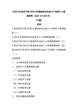 2022年度组织生活会个人对照检查材料(6篇)六个对照:在政治信仰、党员意识、理论学习、能力本领、作用发挥、纪律作风六个方面查摆问题与不足(―)按照局支部开展组织生活会的通知要求,本人紧扣本次民主生活会主题,在深入学习的基础上,结合自身实际和工作情况,对照“六个方面”内容,深入查摆问题不足,深刻剖析问题根源,进一步明确整改措施和努力方向。现将本人对照检查情况汇报如下:—、存在问题(一)政治信仰方面。理想信念有所淡化。具体表现在:对实现共产主义远大理想的长期性、复杂性、艰巨性认识不足,对马列主义、毛泽东思想、邓小平理论和习近平新时代中国特色社会主义思想的精神实质学习理解不深刻,理想信念相对淡化。...