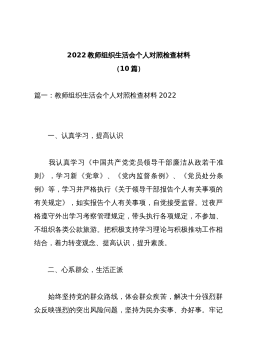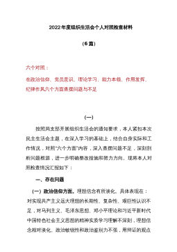 2022年度组织生活会个人对照检查材料(6篇)六个对照:在政治信仰、党员意识、理论学习、能力本领、作用发挥、纪律作风六个方面查摆问题与不足(―)按照局支部开展组织生活会的通知要求,本人紧扣本次民主生活会主题,在深入学习的基础上,结合自身实际和工作情况,对照“六个方面”内容,深入查摆问题不足,深刻剖析问题根源,进一步明确整改措施和努力方向。现将本人对照检查情况汇报如下:—、存在问题(一)政治信仰方面。理想信念有所淡化。具体表现在:对实现共产主义远大理想的长期性、复杂性、艰巨性认识不足,对马列主义、毛泽东思想、邓小平理论和习近平新时代中国特色社会主义思想的精神实质学习理解不深刻,理想信念相对淡化。...