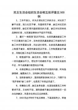 2022年组织生活会批评和自我批评语集锦(552条)1.学风不正、知行不一。有的不愿学,缺乏学习的兴趣和热情,拿起书本就发困,提起笔来就头疼。有的不勤学,心浮气躁,人坐不住,心静不下,半年读不完一本书。有的不真学,用来装点门面、摆摆样子、敷衍了事、浅尝辄止,满足于一知半解。有的学用“两张皮”,学而不思、学而不行,说一套做一套,学一套用一套,遇到矛盾困难就无所适从、束手无策。2.学用脱节、学用“两张皮”。没有真正做到理论联系实际,不善于运用马克思主义的立场、观点和方法去分析解决实际问题;满足于一般性的学习,带着问题学、深入思考学做得不够,理论思维还需要进一步提高;开展工作更多的是拼人脉、靠积累、...