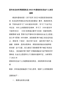 某市农业农村局普通党员2023年度组织生活会个人发言提纲根据市委组织部《关于召开2022年度基层党组织组织生活会和开展民主评议党员的通知》要求,我原原本本、逐字逐句的学习了XXX报告和党章,学习了习近平总书记在XXX上的重要讲话精神,学习了《XXX报告学习辅导百问》《XXX党章修正案学习问答》等辅导材料。紧紧围绕“全面贯彻习近平新时代中国特色社会主义思想,深入学习贯彻XXX精神,深刻领悟‘两个确立’的决定性意义,增强‘四个意识’、坚定‘四个自信’、做到‘两个维护’,弘扬建党精神,坚持自我革命,增强党组织政治功能和组织功能”这个主题,深入查找了深刻领悟“两个确立”的决定性意义、坚决做到“两个维护...