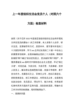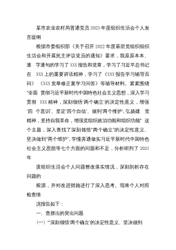 某市农业农村局普通党员2023年度组织生活会个人发言提纲根据市委组织部《关于召开2022年度基层党组织组织生活会和开展民主评议党员的通知》要求,我原原本本、逐字逐句的学习了XXX报告和党章,学习了习近平总书记在XXX上的重要讲话精神,学习了《XXX报告学习辅导百问》《XXX党章修正案学习问答》等辅导材料。紧紧围绕“全面贯彻习近平新时代中国特色社会主义思想,深入学习贯彻XXX精神,深刻领悟‘两个确立’的决定性意义,增强‘四个意识’、坚定‘四个自信’、做到‘两个维护’,弘扬建党精神,坚持自我革命,增强党组织政治功能和组织功能”这个主题,深入查找了深刻领悟“两个确立”的决定性意义、坚决做到“两个维护...
