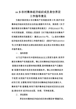 xx乡农村集体经济组织成员身份界定工作指导意见为稳步推进我乡农村集体产权制度改革工作,保护农村集体经济组织成员的合法权益,根据中共中央、国务院《关于稳步推进农村集体产权制度改革的意见》(中发(2016)37号)、中共河南省委、河南省人民政府《关于稳步推进农村集体产权制度改革的实施意见》(豫发(2017)15号)、《xx县农村集体经济组织成员身份界定工作指导意见》(固农产改办(2019)14号)文件要求和相关法律法规的规定,结合我乡实际情况,制定本指导意见。一.指导思想以习近平新时代中国特色社会主义思想为指导,有序开展农村集体产权制度改革。确认农村集体经济组织成员身份,是稳定完善农村经营体制的需...