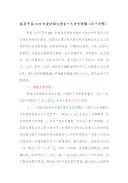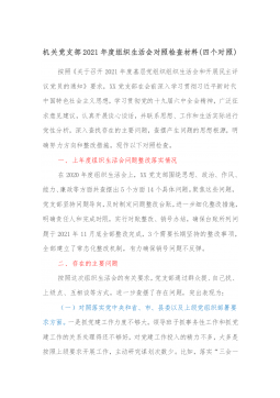 领导干部2021年度组织生活会“四个对照”个人对照检查材料(县级常务副部长)根据《中共××县委组织部关于召开2021年度基层党组织组织生活会和开展民主评议党员的通知》要求,本人结合一年来的学习、工作、生活等实际情况,对照“党中央和习近平总书记的号召和要求、新时代合格党员标准、入党誓词、革命先辈和先进典型”等4个方面,全面查找在政治、思想、学习、工作、能力、纪律、作风等方面的问题和不足,并进行了认真反思,提出了整改措施,明确了下一步努力方向。现将个人对照检查情况汇报如下。一、存在的问题(一)对照党中央和习近平总书记的号召和要求方面。虽然本人在平时工作和生活中,能够始终坚定正确的政治方向,积极响应...