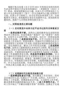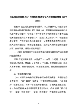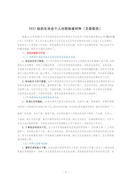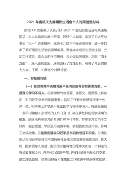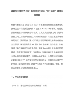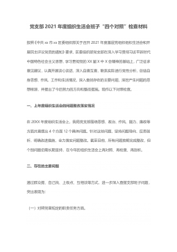 县人大常委会机关党支部2021年度组织生活会班子“四个对照”支委班子对照检查剖析材料根据县委组织部《关于认真组织召开2021年度基层党组织组织生活会和开展民主评议党员工作的通知》和县直工委有关文件要求,结合人大常委会机关支部工作实际,为扎实开展此次组织生活会,会前,支委组织党员认真开展了政治理论自学和集中学习研讨活动,听取了有关方面的意见建议,支委班子成员之间、支部党员之间、党员与群众之间扎实开展了谈心谈话,结合工作实际和党员干部思想等情况,认真撰写了支委班子对照剖析材料。一、党支部2021年工作开展情况一年来,支部工作坚持以习近平新时代中国特色社会主义思想为指导,在机关党组领导和县直机关工委...