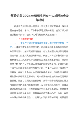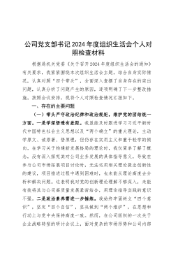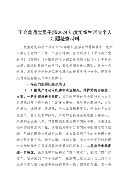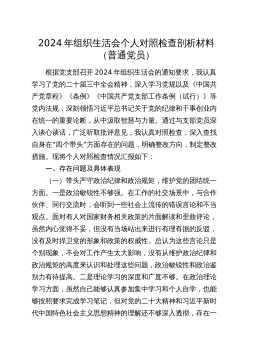 2024年度组织生活会个人对照检查发言材料(1)按照《关于认真开好组织生活会的通知》要求,会前,我深入学习了习近平总书记重要讲话重要指示精神,在认真开展谈心谈话、广泛征求意见建议基础上,围绕“四个带头”深入查找自身短板不足,深入剖析存在的问题,反思问题产生的根源,明确下步整改措施,现作对照查摆如下:一、存在的主要问题(一)带头严守政治纪律和政治规矩,维护党的团结统一方面一是对党的政策理论学习的深度和广度不够,政策理论水平不够高。主要表现是对习近平新时代中国特色社会主义思想学习不透彻,掌握不具体,研究不到位,对新理论学习掌握不全面;树牢“四个意识”,坚定“四个自信”,做到“两个维护”的创新实践措...