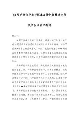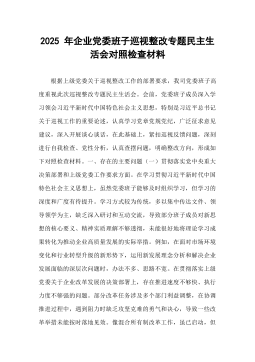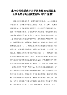 水电公司党委班子关于巡察整改专题民主生活会班子对照检查材料(四个聚焦)根据集团公司党委的统一部署和巡察工作要求,*水电公司党委于近期召开了巡察整改专题民主生活会。此前,在*月*日,集团公司巡察组向公司党委反馈了巡察意见,指出了存在的问题和不足,提出了明确的整改要求。公司党委对此高度重视,将巡察整改作为当前最重要的政治任务,通过召开党委会、中心组学习等形式,深入学习领会巡察反馈意见的精神实质,并紧密围绕“四个聚焦”要求,深刻查摆问题、剖析根源、明确方向。现将公司党委班子对照检查情况报告如下。一、对照查摆存在的主要问题公司党委班子以对党忠诚、对事业负责的态度,对照巡察反馈意见,主动认领、深刻反思,查摆出在四个方面存在的突出问题。(一)聚焦政治引领,在贯彻上级决策部署上存在“温差”党委班子在确保党...