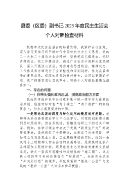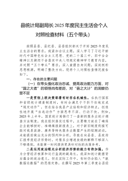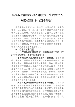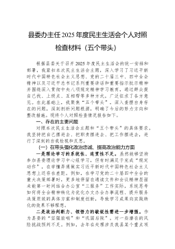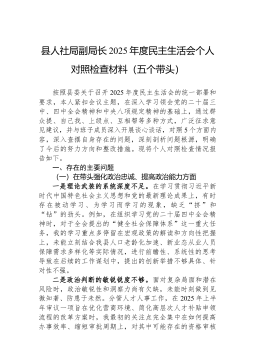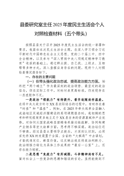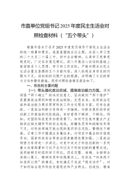 市妇幼保健院2025年度民主生活会领导班子对照检查材料(五个带头)根据市委和市卫生健康委党组的统一部署,XX市妇幼保健院领导班子紧扣本次民主生活会主题,在深入学习研讨、广泛征求意见、开展谈心谈话的基础上,对照5个方面内容,深入查摆存在的突出问题,深刻剖析问题产生的根源,明确了今后的努力方向和整改措施。现将对照检查情况报告如下。一、存在的主要问题(一)在带头强化政治忠忠诚、提高政治能力方面。班子始终将政治建设摆在首位,但在对标对表更高标准和要求时,仍发现存在一些差距和不足。一是将宏观政策转化为具体实践的穿透力有待加强。班子能够及时学习领会党中央关于卫生健康工作的各项大政方针,但在推动政策与医院实际深度融合,特别是将其转化为一线科室可操作可量化的具体工作方案时,存在一定的时滞和折扣。二是应对复杂...