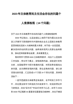 2023年主体教育民主生活会存在的问题个人查摆检视(14个问题)关于2023年主体教育中存在的问题个人查摆检视材料 XXXX书记指出,以县处级以上领导干部为重点在全党深入开展学习贯彻新时代中国特色社会主义思想主体教育是贯彻落实党的X大精神的重大举措,对于统一全党思想、解决党内存在的突出问题、始终保持党同人民群众血肉联系、推动党和国家事业发展,具有重要意义。 我对照学习贯彻XXXX主体教育要求,结合个人思想和工作实际,突出学习重点,深悟精神内涵,深刻进行党性分析,全面梳理学习研讨查摆的问题、对照党章党规找出的问题、走访调研发现的问题、群众反映的问题、谈心谈话指出的问题,汇总形成6个方面14个...