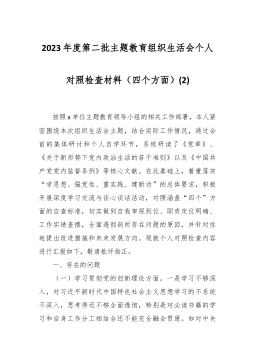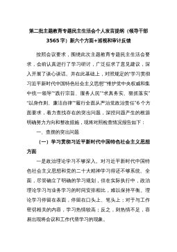 第二批主题教育专题民主生活会个人发言提纲(领导干部3565字)新六个方面+巡视和审计反馈按照会议要求,围绕此次主题教育专题民主生活会要求,会前认真进行了学习研讨,广泛征求了意见建议,深入开展了谈心谈话。并在此基础上,对照规定的“学习贯彻习近平新时代中国特色社会主义思想”“维护党中央权威和集中统一领导”“践行宗旨、服务人民”“求真务实、狠抓落实”“以身作则、廉洁自律”“履行全面从严治党政治责任”6个方面要求,着力查找存在的突出问题,深挖问题产生的根源明确努力方向和整改措施,现将对照检查情况报告如下:一、查摆的突出问题(一)学习贯彻习近平新时代中国特色社会主义思想方面一是政治理论学习不够深入。对习...