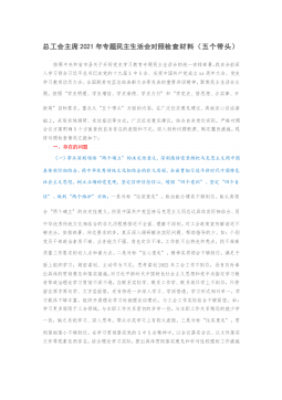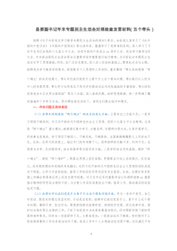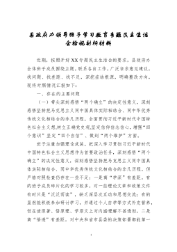 ·1县政府办领导班子学习教育专题民主生活会检视剖析材料近期,按照开好XX专题民主生活会的要求,县政府办全体班子成员围绕主题,联系各自工作,广泛征求意见建议,找问题、找差距、找不足,深挖症结根源,明确整改方向,现将对照情况汇报如下:一、存在的主要问题(一)带头深刻感悟“两个确立”的决定性意义,深刻感悟坚持把马克思主义同中国具体实际相结合、同中华优秀传统文化相结合的非凡历程,全面贯彻习近平新时代中国特色社会主义想,树立正确党史观,坚定信仰信念信心,增强“四个意识”坚定“四个自信”、做到“两个维护”方面。班子注重加强理论武装,把深入学习贯彻习近平新时代中国特色社会主义思想作为首要政治任务,深刻感悟“...