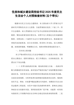 住房和城乡建设局党组书记2025年度民主生活会个人对照检查材料(五个带头)根据本次民主生活会主题要求,本人紧扣深入学习贯彻习近平新时代中国特色社会主义思想,全面贯彻落实党的二十届三中、四中全会精神,深入贯彻落实习近平总书记重要讲话和重要指示批示精神,聚焦高质量发展首要任务,对照中央八项规定及其实施细则精神,对照党的二十届四中全会关于统筹发展和安全、推进城市治理现代化的新要求,结合自身思想、职责和工作实际,深入查摆问题,深刻剖析根源,明确整改方向。现将对照检查情况报告如下。一、存在的主要问题本人严格对照本次民主生活会明确的五个方面重点内容,坚持把自己摆进去、把职责摆进去、把工作摆进去,认真检视反思,查摆出以下突出问题。(一)在带头强化政治忠诚、提高政治能力方面。一是政治判断力的敏锐性有待加强。...