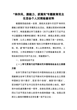 “转作风、提能力、抓落实”专题教育民主生活会个人对照检查材料根据局党组的统一安排,局机关支部今天召开“转作风提能力抓落实”党员专题民主生活会。我通过前段时间的集中学习,特别是通过学习县委办《关于认真学习习近平总书记重要批示精神的通知》等文件后,使我从思想上受到了教育,认识上得到了提高,观念上得到了进一步转变。对照“转作风提能力抓落实”相关文件精神中所指出的“宽、松、软、虚”等不良现象,本人从思想作风、理论学风、工作作风、工作纪律等各个方面进行了对照检查和反思,发现自身仍存在许多不足之处,现查摆如下。一、自身存在的不足(一)学习贯彻习近平新时代中国特色社会主义思想方面在学习贯彻习近平新时代中国特...