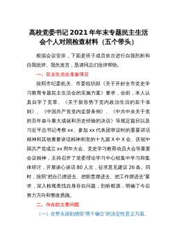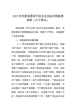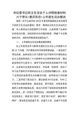 市纪委书记民主生活会个人对照检查材料六个带头+意识形态+上年度生活会整改按照《关于认真开好2022年度党和国家机关党员领导干部民主生活会的通知》要求,围绕此次民主生活会的主题,本人联系自己的思想和工作实际,认真查摆了自身存在的突出问题,深刻剖析存在问题的根源,明确了今后整改的方向。现将对照检查情况报告如下。一、 上年度民主生活会整改落实情况在上年度党史学习教育专题民主生活会上共查摆六方面11个问题,均已整改完毕并取得明显成效。一是加强了理论武装。始终把深入学习贯彻习近平新时代中国特色社会主义思想和党的二十大精神作为主线和根本任务,通过参加理论中心组学习、领导干部读书班和支部集中学习研讨,以及每...