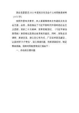XX市纪委书记民主生活会个人六个带头对照检查材料(全文4726字)按照《关于认真开好2022年度党和国家机关党员领导干部民主生活会的通知》要求,围绕此次民主生活会的主题,本人联系自己的思想和工作实际,认真查摆了自身存在的突出问题,深刻剖析存在问题的根源,明确了今后整改的方向。现将对照检查情况报告如下。一、上年度民主生活会整改落实情况在上年度党史学习教育专题民主生活会上共查摆六方面11个问题,均已整改完毕并取得明显成效。一是加强了理论武装。始终把深入学习贯彻习近平新时代中国特色社会主义思想和党的XX大精神作为主线和根本任务,通过参加理论中心组学习、领导干部读书班和支部集中学习研讨,以及每天自觉坚...