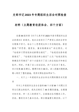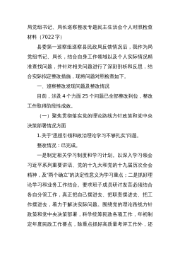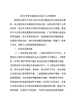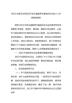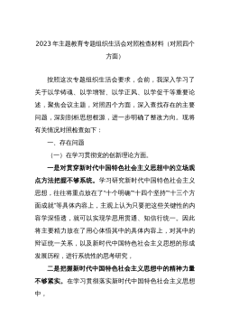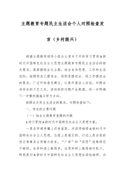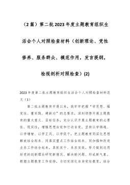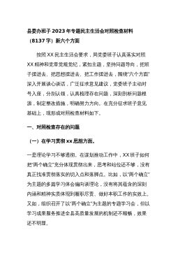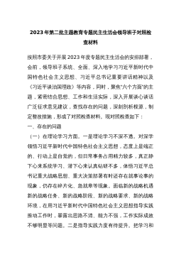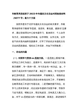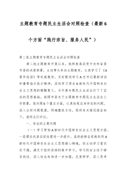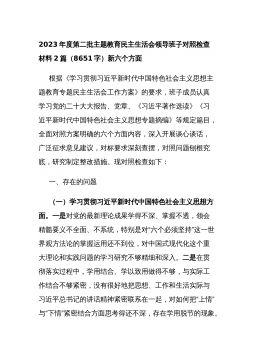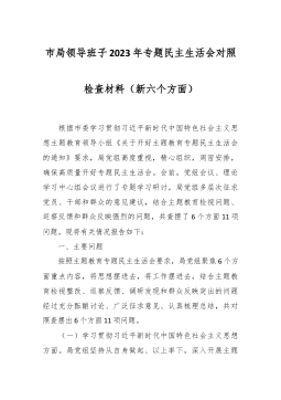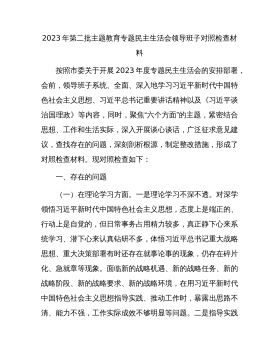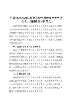 分管领导2023年度第二批主题教育民主生活会个人对照检查材料范文根据市委组织部、市主题教育办关于开好主题教育专题民主生活会统一安排部署,我紧紧围绕主题教育总体目标,聚焦主题教育专题民主生活会主题,立足工作实际,结合会前学习研讨、谈心谈话等情况,对照规定的6个方面,深入查找差距,深刻进行党性分析,明确了今后的努力方向。现将个人对照检查情况报告如下。一、围绕6个方面对照检查情况第二批主题教育开展以来,我牢牢把握“学思想、强党性、重实践、建新功”总要求,坚持把“学思想”作为第一位的任务和贯穿始终的主线,坚持边学习、边对照、边检视、边整改,把问题整改贯穿主题教育始终,把抓好检视整改作为破解难题、推动高...