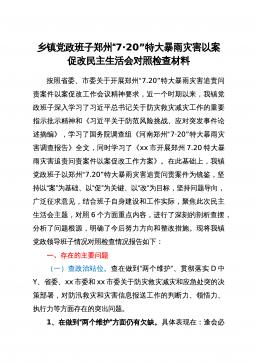 乡镇党政班子郑州“7·20”特大暴雨灾害以案促改民主生活会对照检查材料按照省委、市委关于开展郑州“7.20”特大暴雨灾害追责问责案件以案促改工作会议精神要求,近一个时期以来,我镇党政班子深入学习了习近平总书记关于防灾救灾减灾工作的重要指示批示精神和《习近平关于防范风险挑战、应对突发事件论述摘编》,学习了国务院调查组《河南郑州“7·20”特大暴雨灾害调查报告》全文,同时学习了《xx市开展郑州7.20特大暴雨灾害追责问责案件以案促改工作方案》。在此基础上,我镇党政班子以郑州“7.20”特大暴雨灾害追责问责案件为镜鉴,坚持以“案”为基础、以“促”为关键、以“改”为目标,坚持问题导向,广泛征求意见,结...