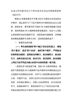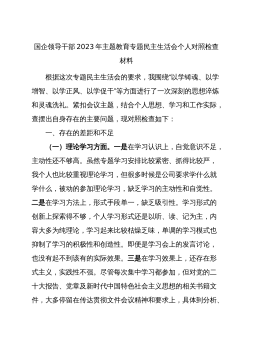 国企领导干部2023年主题教育专题民主生活会个人对照检查材料根据这次专题民主生活会的要求,我围绕“以学铸魂、以学增智、以学正风、以学促干”等方面进行了一次深刻的思想淬炼和灵魂洗礼。紧扣会议主题,结合个人思想、学习和工作实际,查摆出自身存在的主要问题,现对照检查如下:一、存在的差距和不足(一)理论学习方面。一是在学习认识上,自觉意识不足,主动性还不够高。虽然专题学习安排比较紧密、抓得比较严,我个人也比较重视理论学习,但很多时候是公司要求学什么就学什么,被动的参加理论学习,缺乏学习的主动性和自觉性。二是在学习方法上,形式手段单一,缺乏吸引性。学习形式的创新上探索得不够,个人学习形式还是以听、读、记...